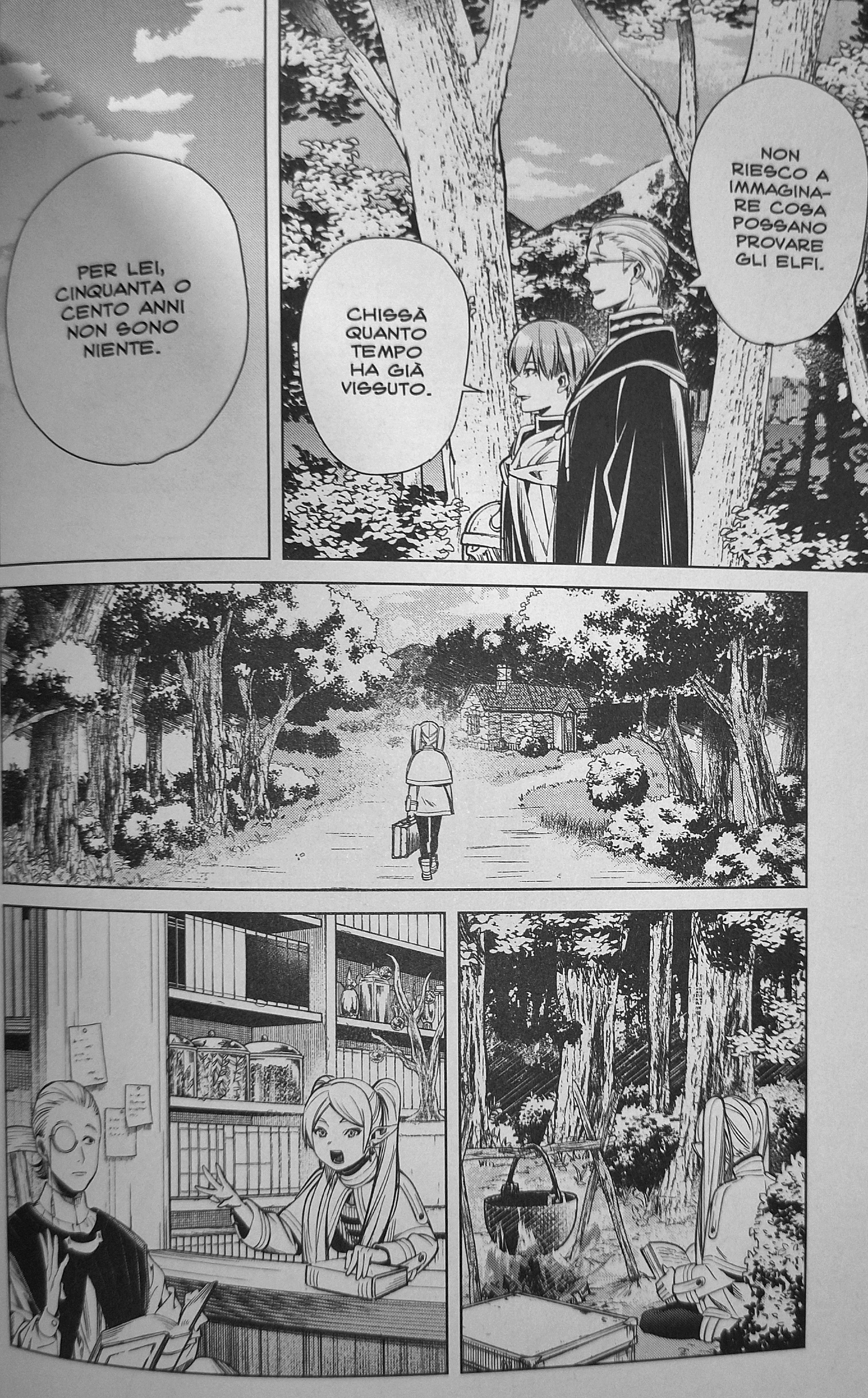Frieren, la maga elfa che da il titolo alla storia, e 3 suoi compagni, tornano al loro villaggio dopo un viaggio di 10 anni; scena che sul momento mi ha fatto storcere il naso, perché sembrava (e tutt'ora mi sembra) un cliché palloso, ma la storia non tarda a svilupparsi in modo intrigante subito dopo. Il tempo di una festa di ritorno per gli avventurieri, e il giorno dopo Frieren subito se ne parte per tornare alle sue avventure più personali, nel campo onestamente oggettivamente invidiabile di "raccoglimento di magie". E così, in appena un paio di vignette, passano altri 50 anni come se fossero niente...