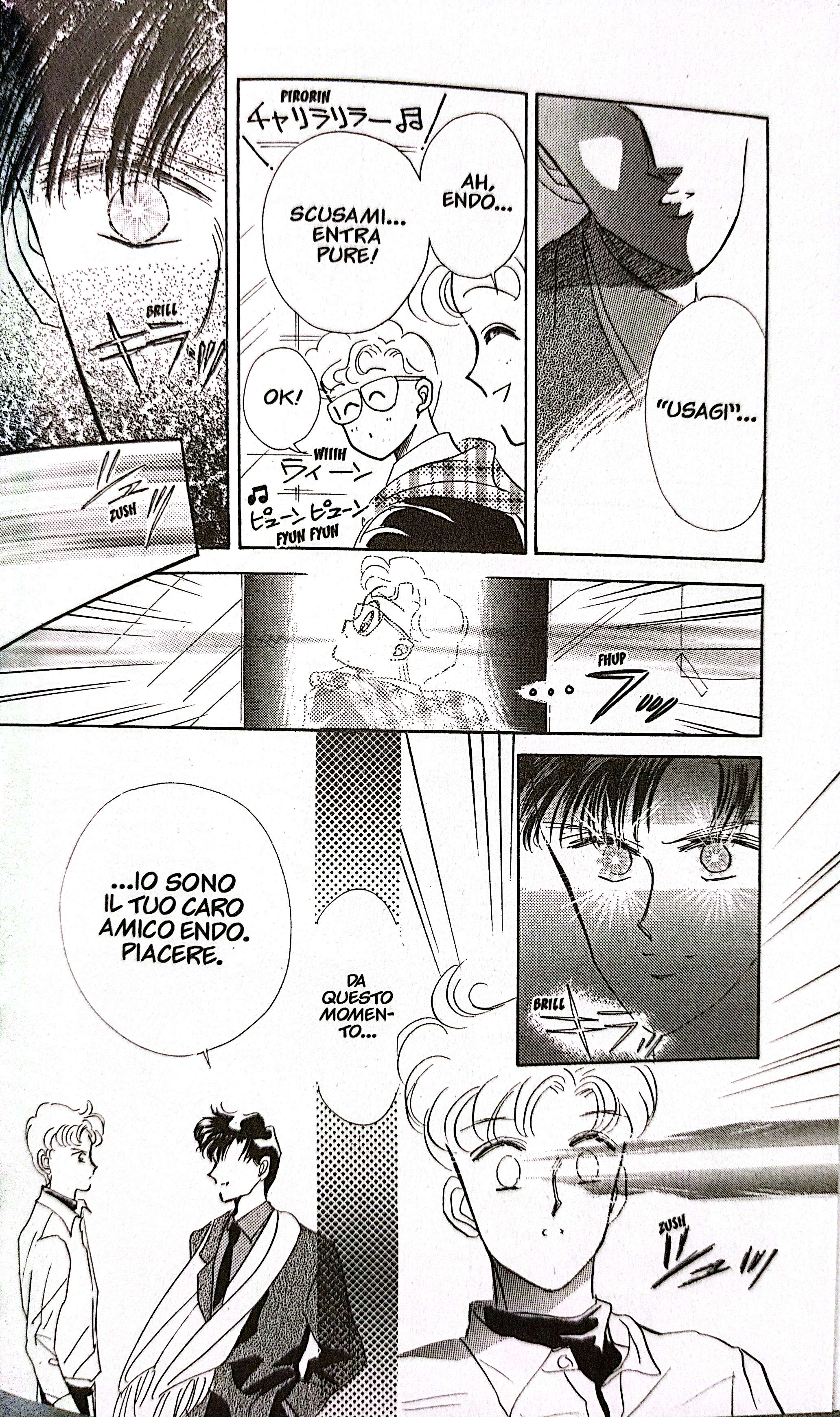 È veramente terrificante, non ho altre parole. Per lievissima fortuna, un po' questa scelta gli si ritorce contro, perché, date le varie differenze personali spuntate fuori (come il fatto che Endo andasse all'università, ma Mamoru era un liceale), Usagi si accorge che c'è qualcosa di strano in questo soggetto che in un attimo diventa morbosamente interessato a lei; nonostante che, se non fosse per le strambe attitudini, le sembrerebbe esattamente Tuxedo Mask. È però strano che, pur capendo che questo tizio non è in realtà Mamoru, Usagi ne sia attratta in un modo che non riesce a spiegare (...in parte sempre con il cuore che le batte in modo pazzo, ma c'è anche dell'altro di ignoto), e continua a frequentarlo nella sala giochi, pur non finendo mai completamente suggestionata.