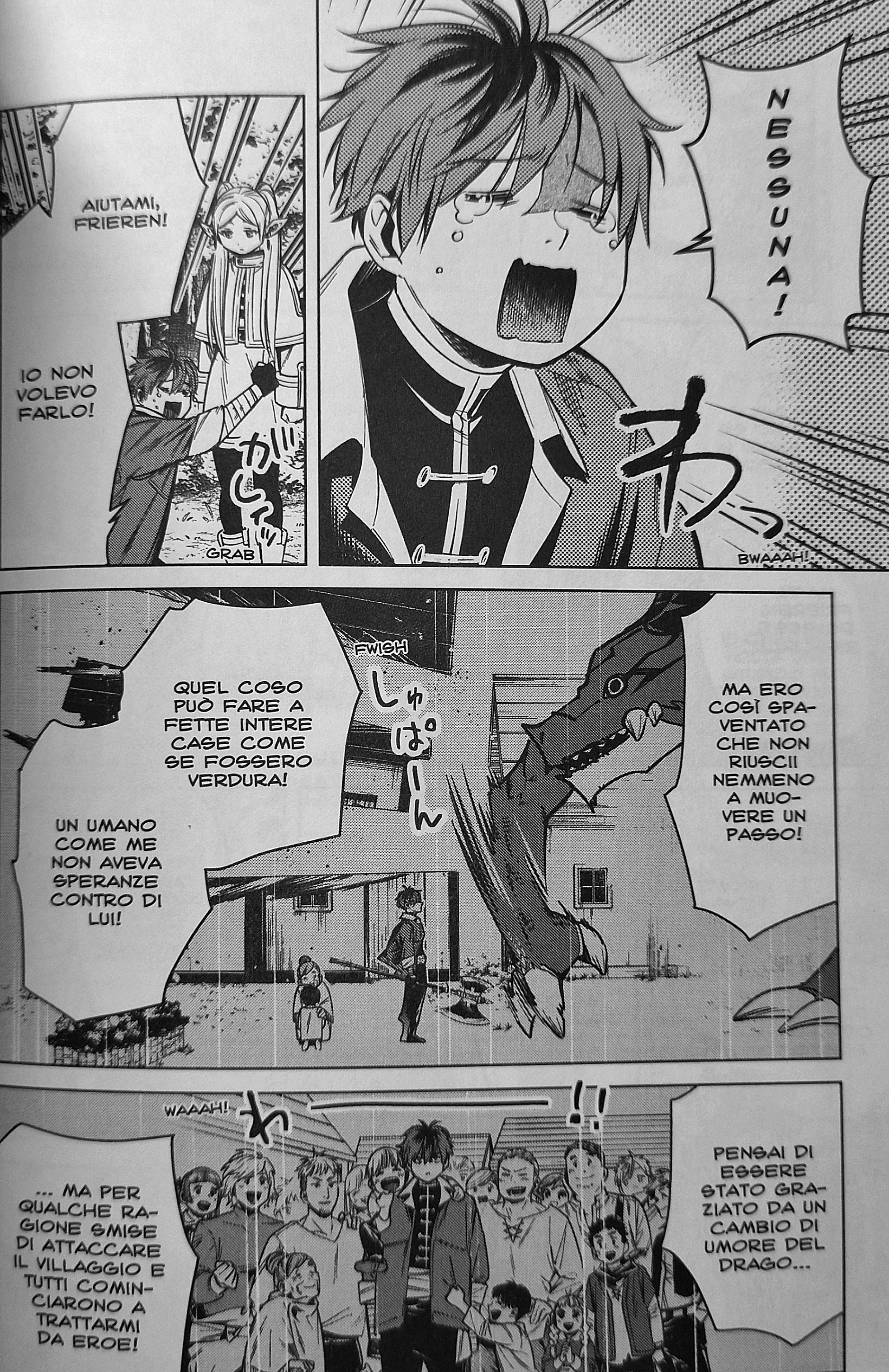Tra l'altro, Frieren cerca di giustificare l'abbattimento dicendo che l'animale è troppo pericoloso, e avrà ucciso diversi avventurieri capitatigli a tiro, quindi è meglio così... che mi sembra una logica pericolosamente simile a quella con cui nel nostro mondo si eliminano orsi o altri animali pericolosi nel momento in cui qualche scemo va nel suo habitat provando a farcisi un selfie, e loro da animali quali sono rispondono sbranandoli... Vabbé, è colpa del drago se negli anni ha mangiato chi è andato a dargli fastidio, mi pare giusto.