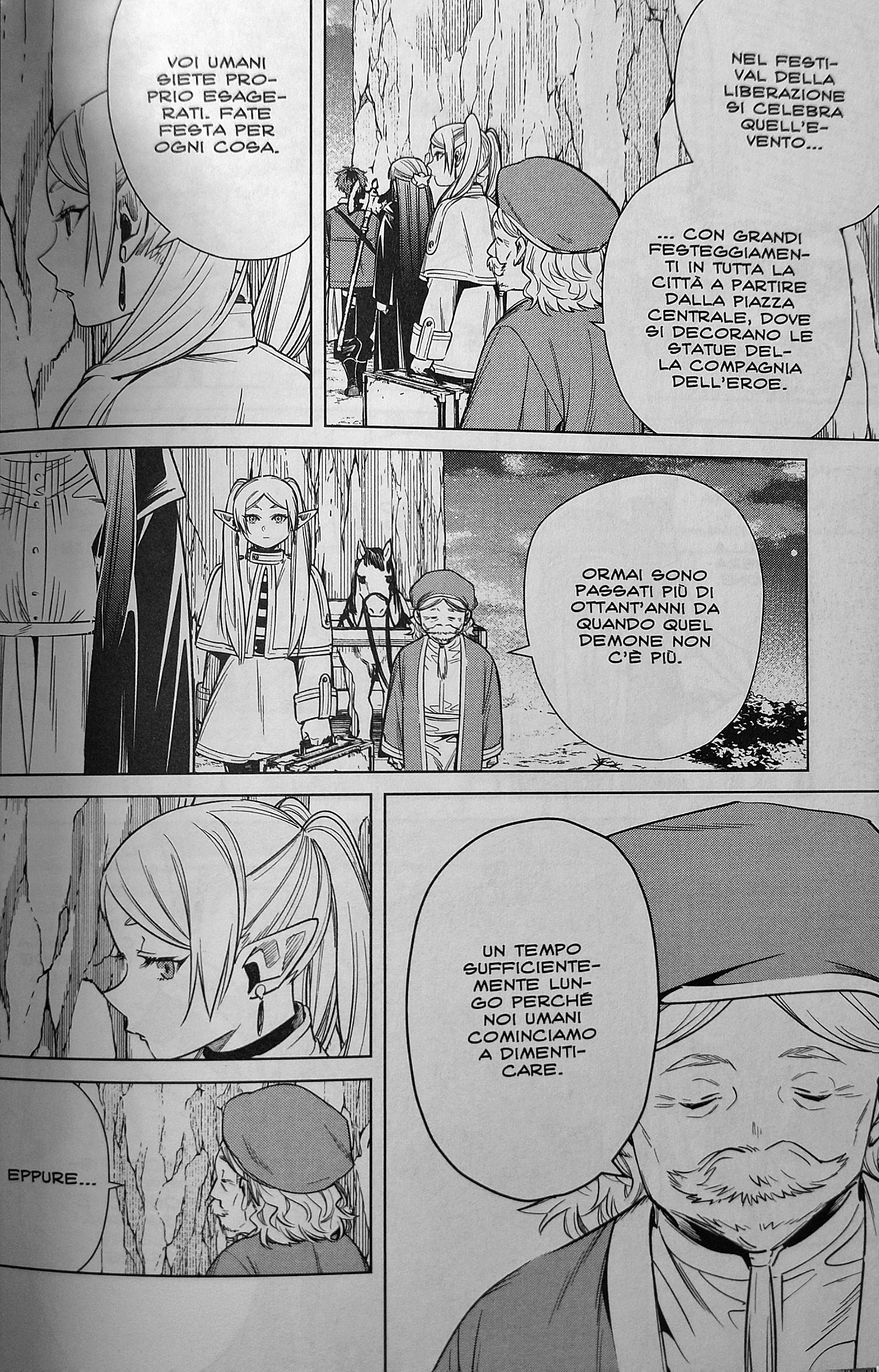 Himmel aveva un po' questa cosa di voler essere ricordato per sempre, e quindi a suo tempo se n'è fatto fare un bel po', di statue, ritratto da solo ma anche con i suoi compagni. Paranoico si, ma lungimirante, lui, che perfettamente sapeva che, nell'arco di più o meno un intero cambio di generazione, gli umani tendono a dimenticare cose per loro altrimenti anche importanti, se non riviste e ripetute. Ma, una statua (...che forse a questo punto potrei considerare di farmi fare anche io, visto che per una volta ho un terrore in comune con Himmel anziché Frieren in questa storia) non basta: serve anche stabilire una tradizione... altrimenti, come visto anche al capitolo 3, il ricordo svanisce. Un po' triste, è vero, e infatti anche Frieren non lo comprende propriamente, ma che ci vogliamo fare...