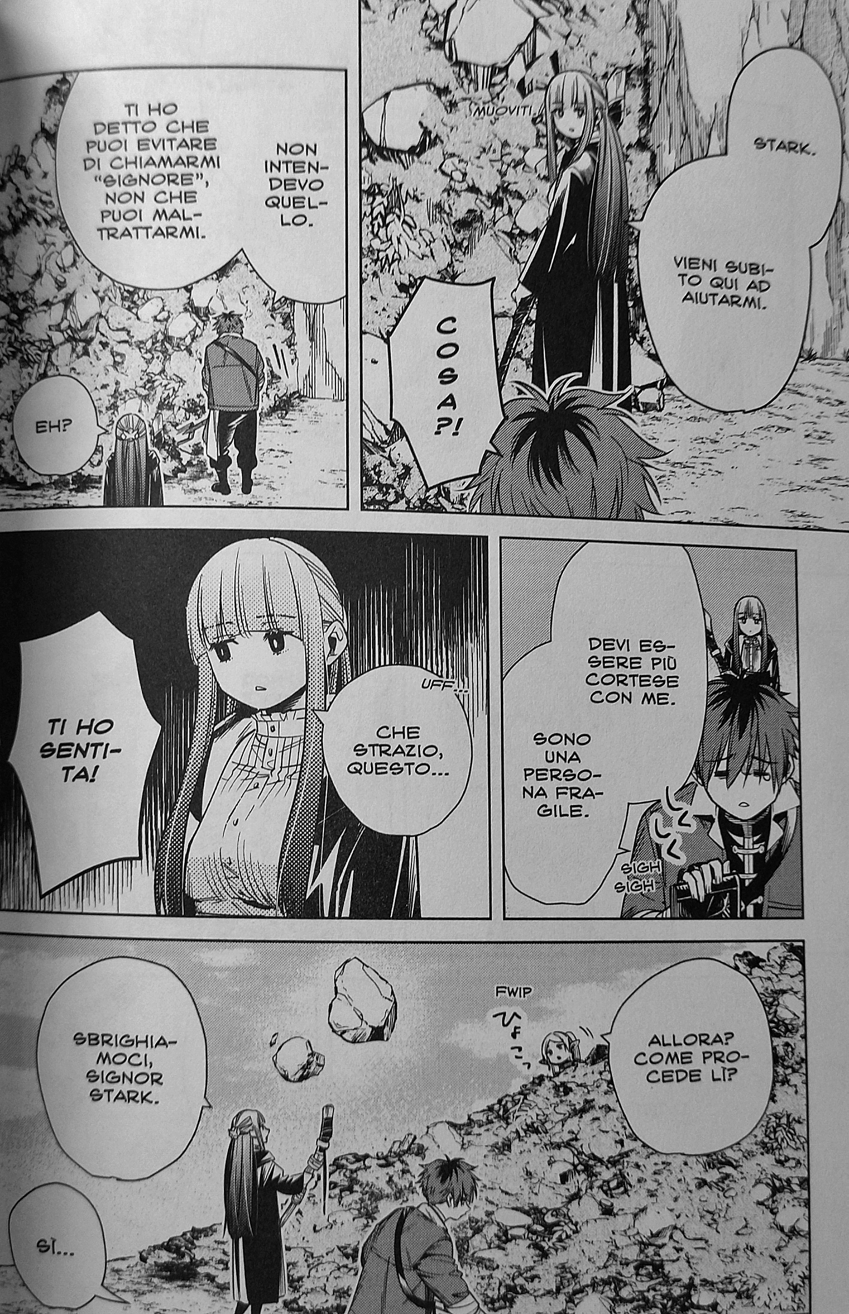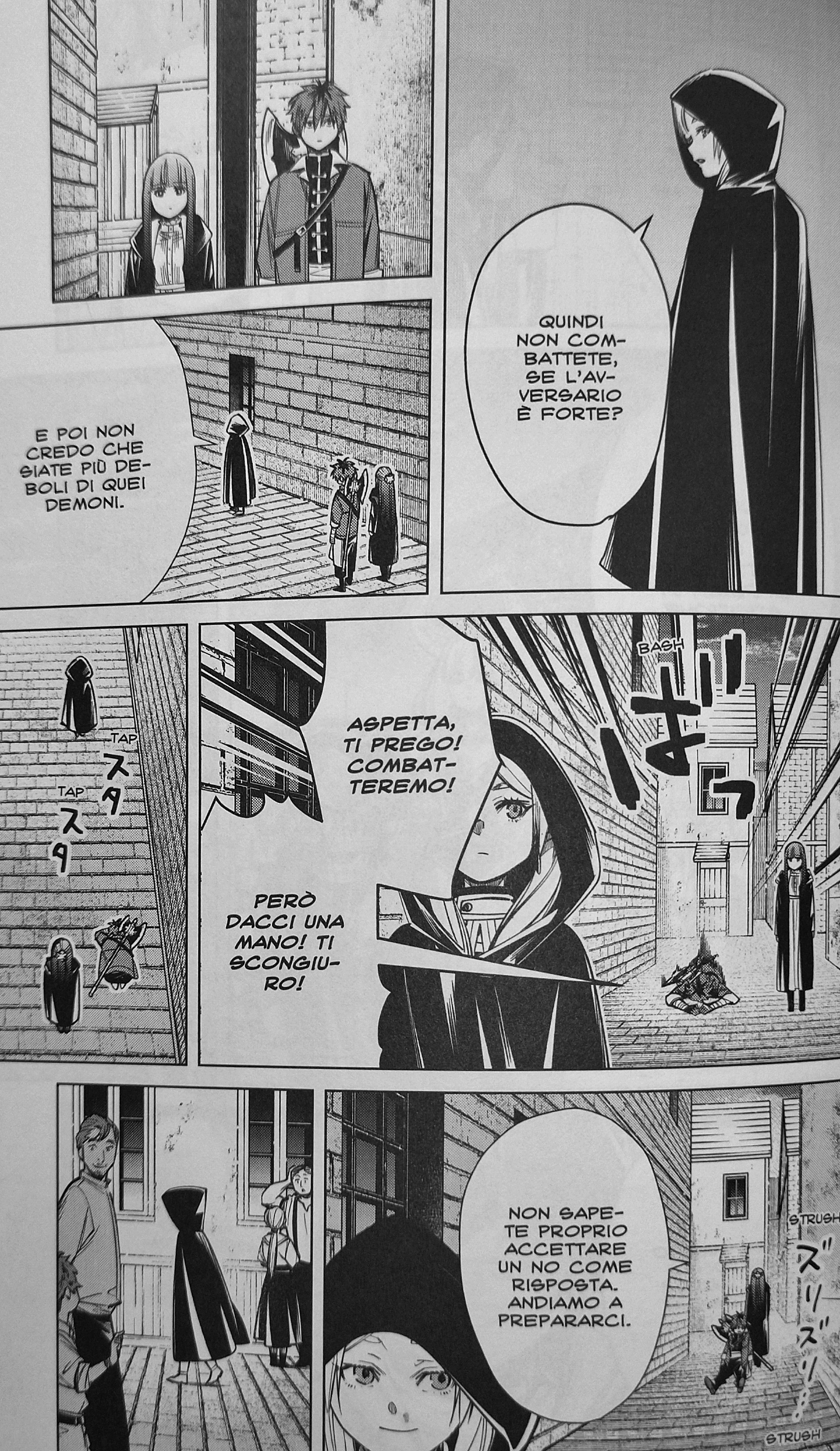 Ciò che rimane a questo punto allora è, per loro sfortuna, il peso di dover salvare l'intera città dai demoni, per Fern e Stark. Frieren quasi li lascia da soli e loro, giustamente terrorizzati, hanno dovuto chiederle praticamente in ginocchio di essere almeno aiutati nell'impresa, vabbé. Che poi, da un lato, la somma ha anche ragione, perché nessuno li sta obbligando a rimanere lì a combattere... ma loro due sentono giustamente di dover fare il loro dovere, e quindi è ora di prepararsi. Tanti auguri a chi non muore, allora...