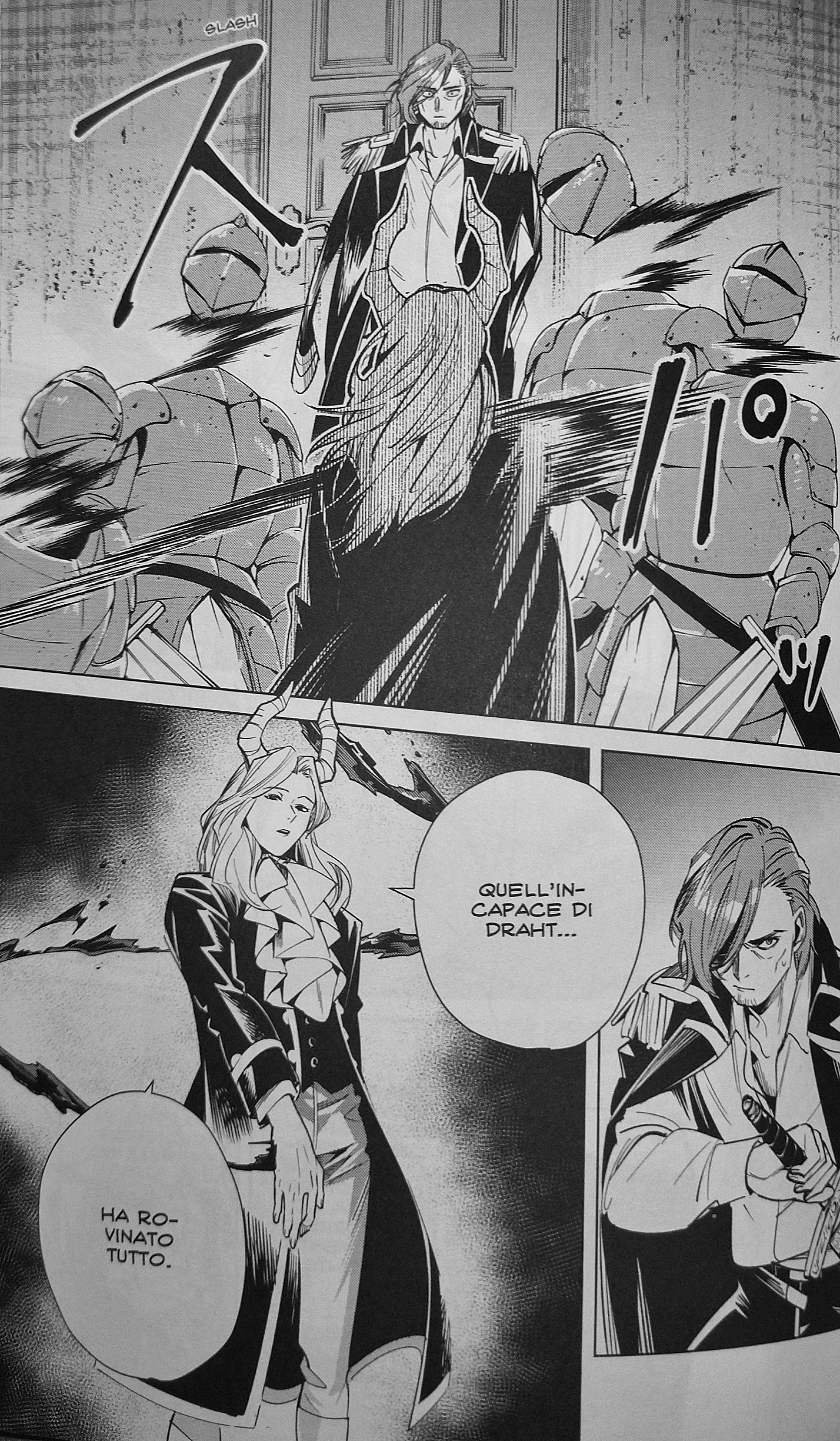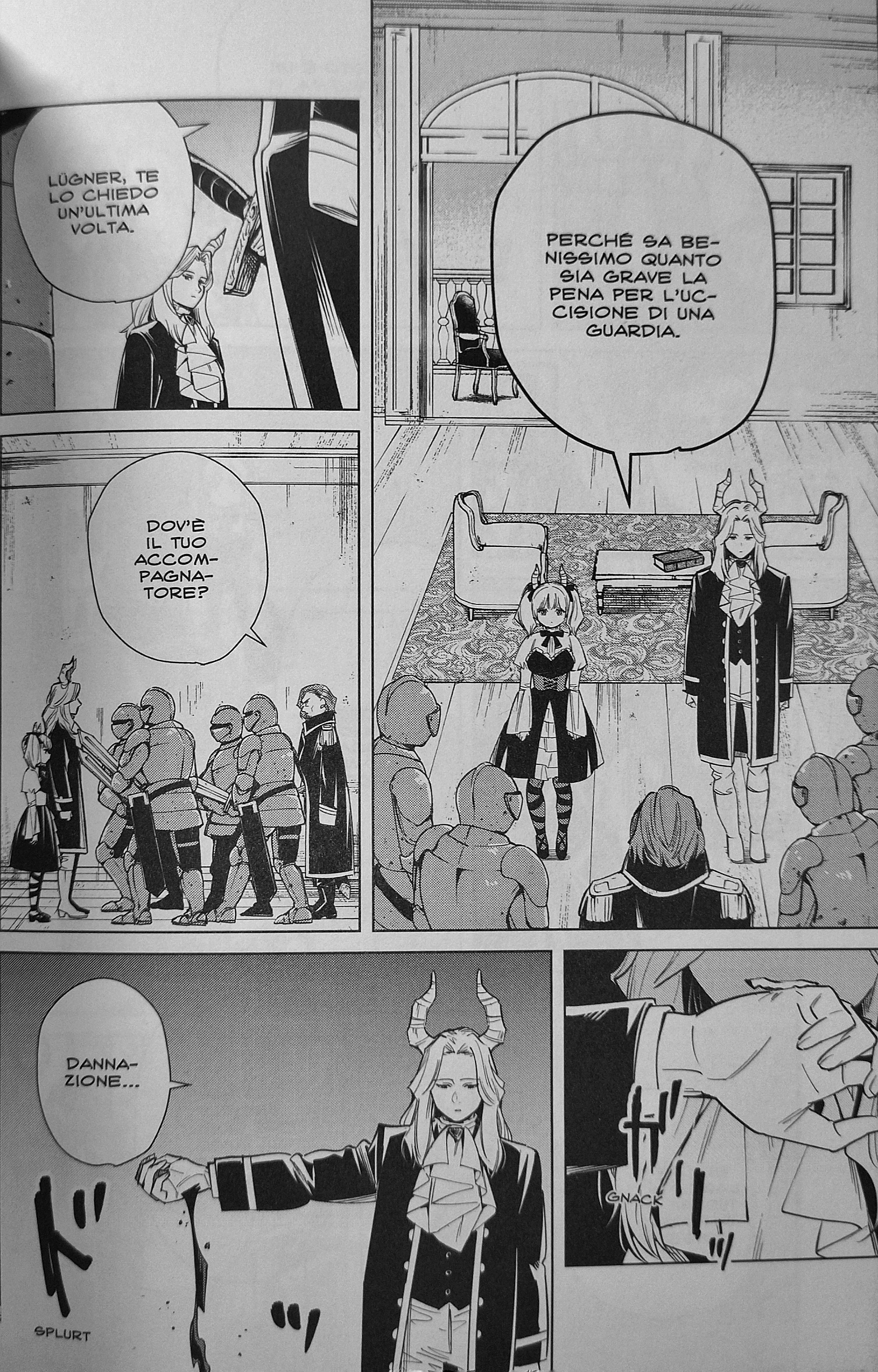 Dall'altro lato, il conte inizia a sospettare di nuovo dei demoni (e buongiorno...), visto che nota che uno dei tre è sparito, ma le scuse di Lügner a riguardo sono del calibro di "è andato in bagno"... decisamente poco convincente. Con l'insistenza di Granat però, che gli punta nuovamente le spade, com'è ormai ciclico per questo tipo di mostri, Lügner se la prende a male, e prima uccide in un colpo tutte le guardie che erano lì, poi colpisce anche il conte senza però finirlo, con l'idea di farsi aiutare nei suoi scopi... e io ho ovviamente brutti presentimenti a riguardo.