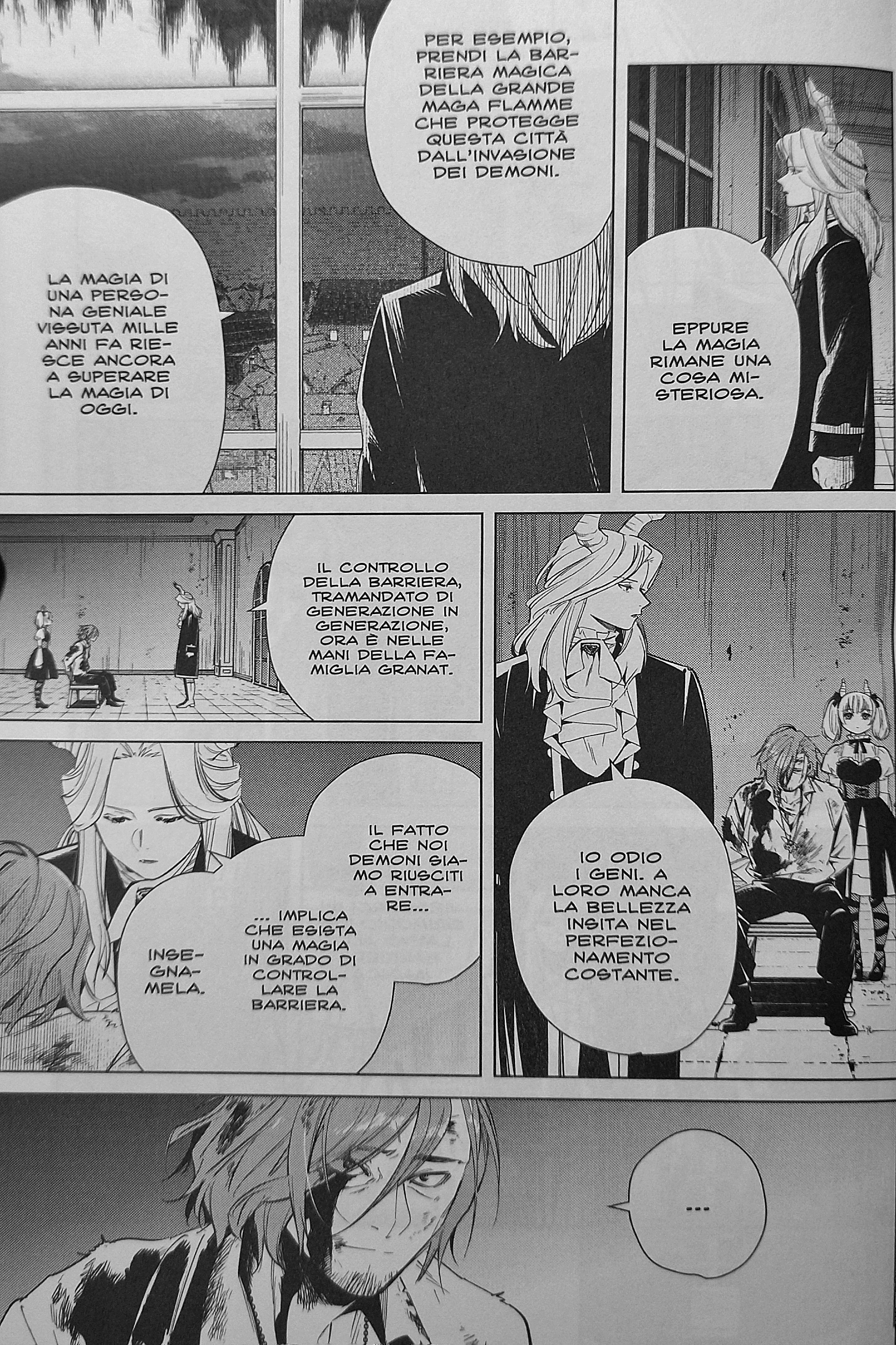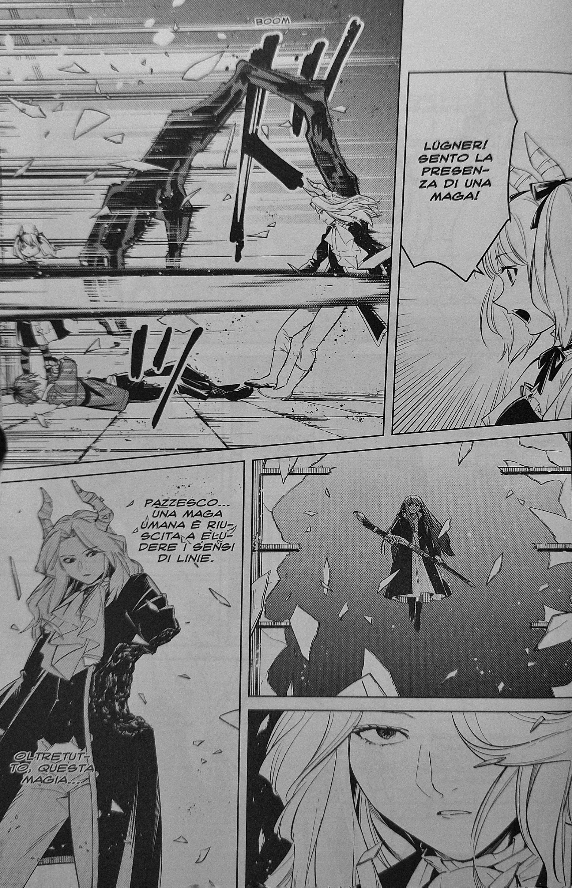 Come da me previsto, Lügner e la piccoletta Linie volevano in realtà semplicemente torturare Granat... probabilmente perché lui intanto non li aiuta con la rimozione della barriera magica che protegge la città; ma, ovviamente, ciò non è che li giustifica. Ora, quindi, Stark trova il conte in pessime condizioni, ma non è particolarmente stupito di ciò; purtroppo, non riesce a liberarlo dalla sedia dove è stato legato (avranno usato qualche corda maledetta con la loro magia, mi sa), e passa abbastanza tempo che quelli lì tornano nella stanza, dopo che si erano allontanati.