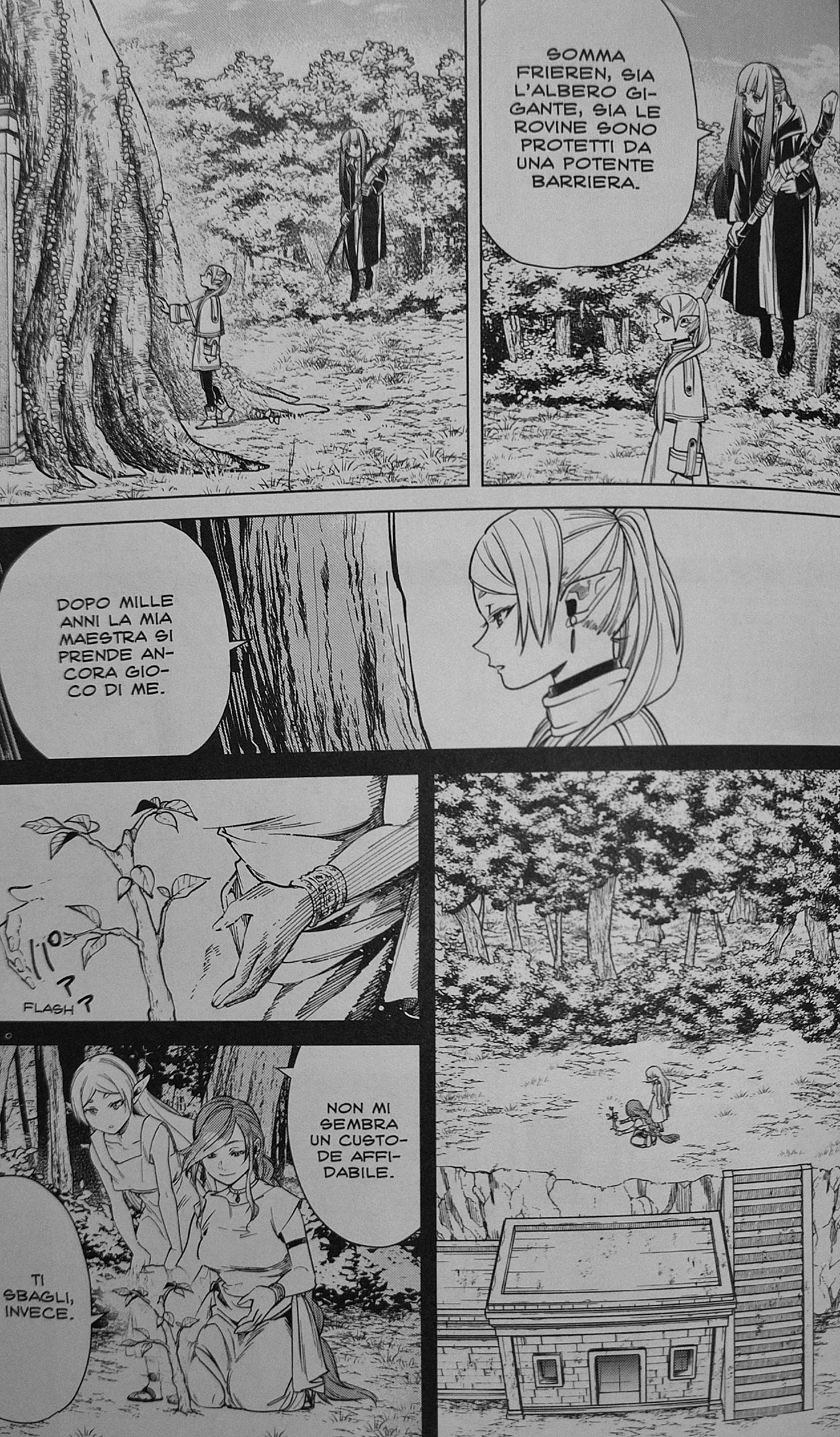 Per qualche motivo, forse perché la premessa la secca, visto che non crede nel poter contattare i morti e cose di questo tipo (e, insomma, le si può forse dare torto?), all'inizio Frieren fa finta di non sapere di questo libro, e di dove si trovi... ma, volente o nolente, le ricerche si svolgono comunque e si svolgono relativamente spedite, sia perché altrimenti Fern si scoccia (anche a lei, come darle torto...), sia perché Eisen conosce l'area generale di questo cimelio in base a ricerche fatte da Heiter. Precisamente, cercano un albero grosso particolare — che in effetti, in mezzo ad un'intera foresta, non è proprio facile — e ne trovano uno che ha inghiottito una specie di casetta... ed esce fuori, dai ricordi dell'elfa, che questo fu piantato 1000 anni prima, da lei e Flamme in persona.