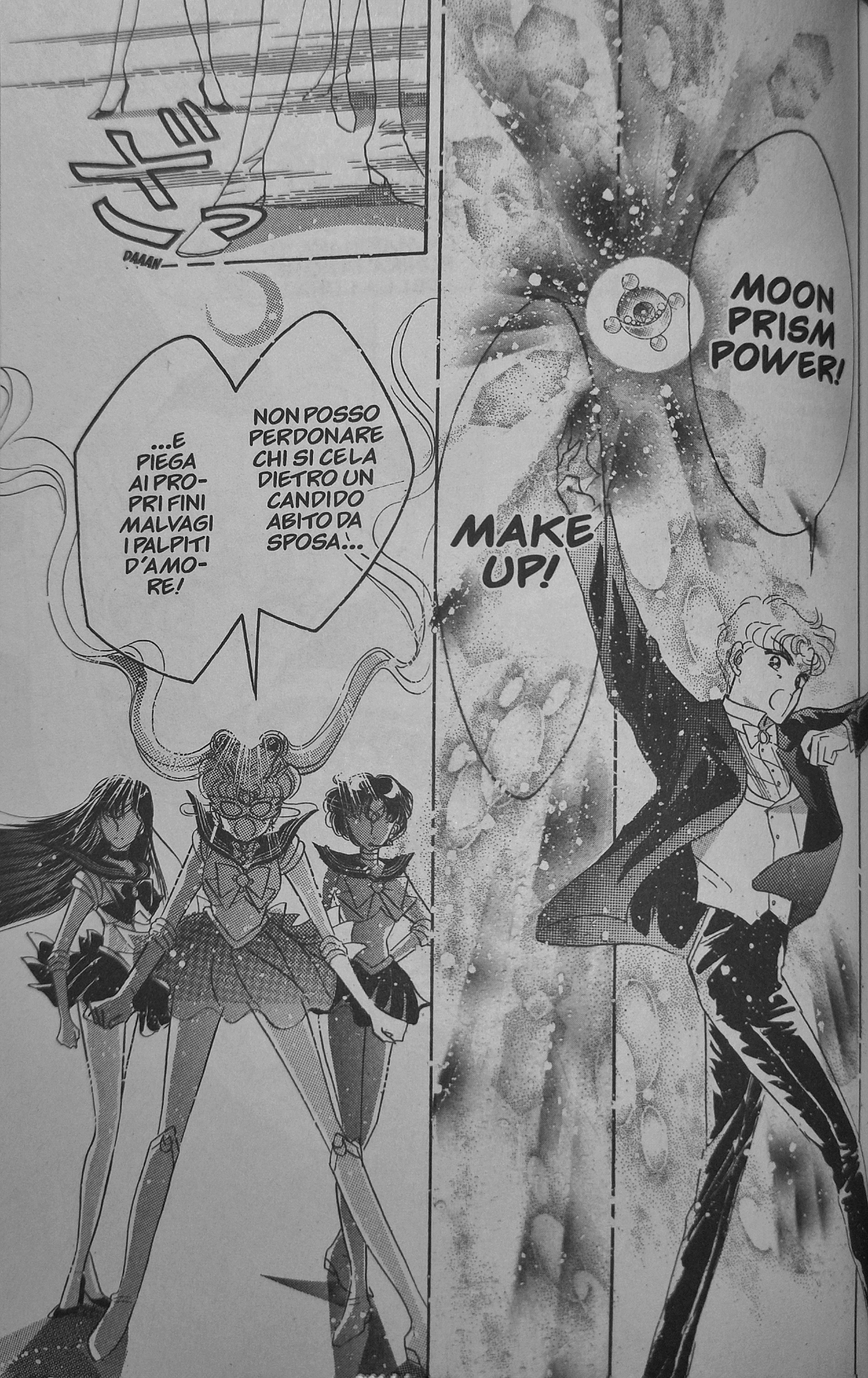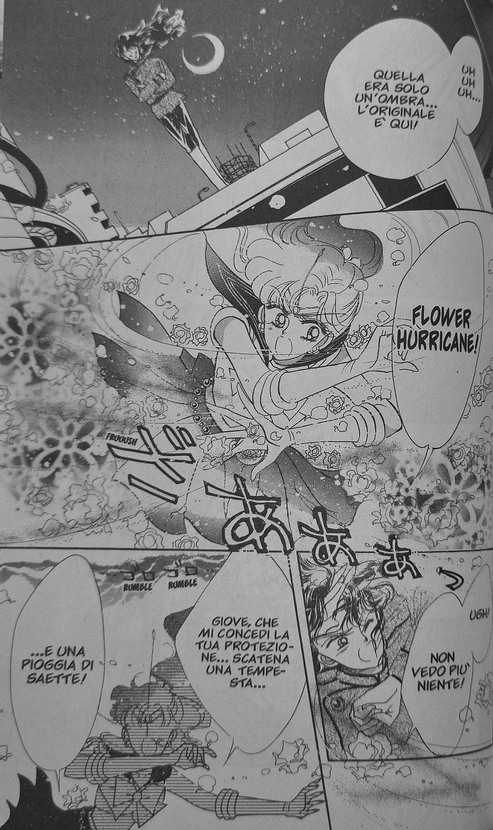 Beh, come previsto, Makoto si risveglia: è la guerriera del tuono e del coraggio (ed in effetti ha un bel po' di entrambe le cose), ma a dire il vero anche con delle belle caratteristiche floreali in mezzo; infatti, mentre il suo attacco letale contro Nepherite è il Jupiter Thunderbolt, un attimo prima fa un certo Flower Hurricane che lo disorienta. Sono però rimasta particolarmente sorpresa da quanto rapido e sicuro è stato questo suo risveglio: le è bastato sentire come le altre ragazze stavano facendo una rapida ramanzina al nemico su come sia sbagliato ingannare le donne (specialmente con la magia nera, aggiungerei io), in questo caso proprio Makoto, e in lei si è prima liberata quella particolare forza sollevante, mentre attimi dopo ha persino in qualche modo capito di stare sotto la protezione di Giove. Non mi spiego tutto ciò!