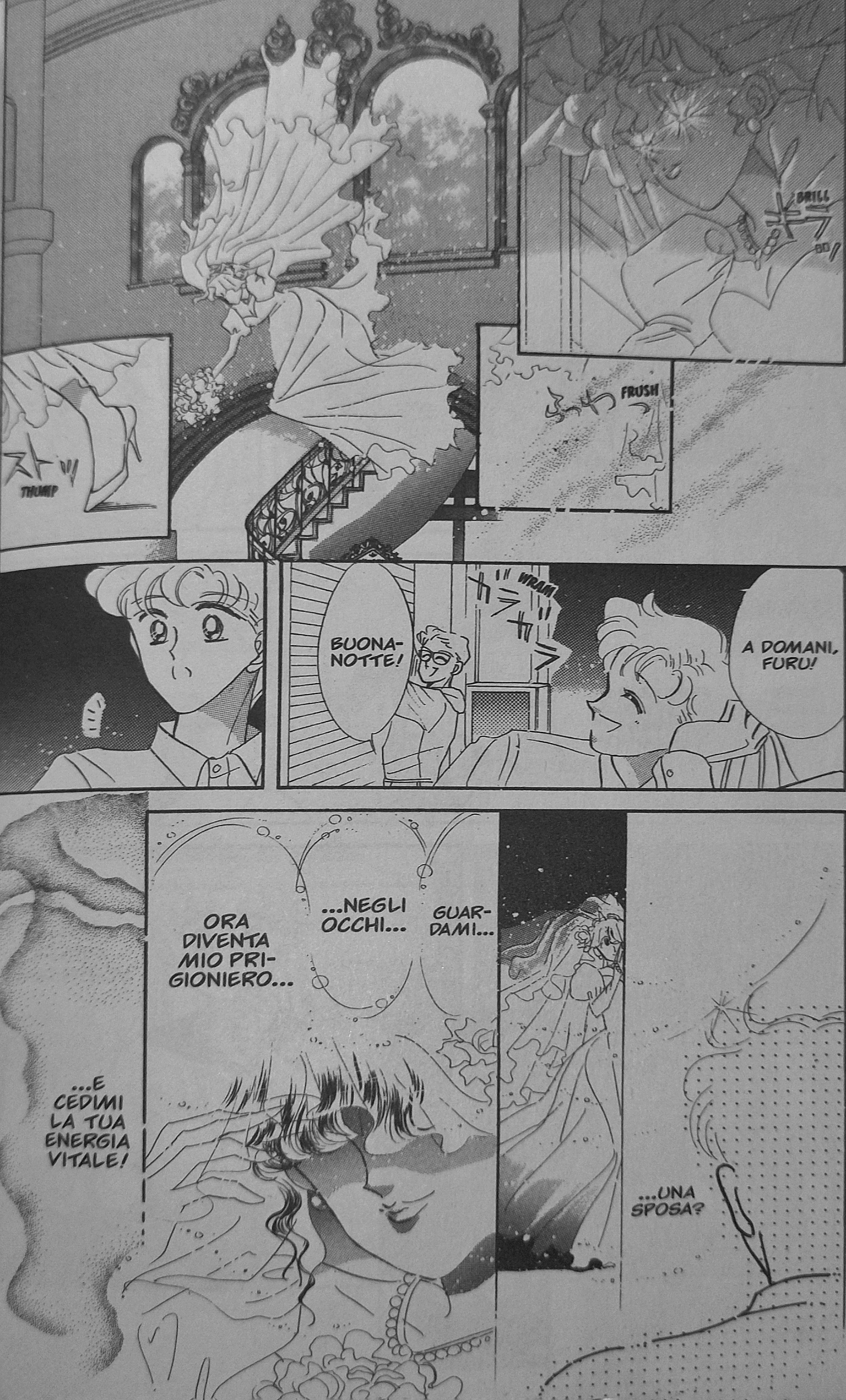 Ci sono allora motivi per cui festeggiare, forse (...anzi, direi certamente, perché tanto il titolo del capitolo fa già capire cosa dovrà accadere alla finissima), ma fino a un certo punto. Si scopre infatti che la cugina di Naru, l'amica di Usagi, che a breve si sarebbe dovuta sposare, è rimasta da un momento all'altro senza il promesso marito, che è del tutto scomparso senza lasciare tracce... e, per quanto di solito si farebbe forse bene a sospettare motivazioni non paranormali per fenomeni del genere, sappiamo bene che in questo mondo, in questa città, non passa praticamente un singolo giorno senza che i nemici dell'oltretomba facciano delle loro scemenze.